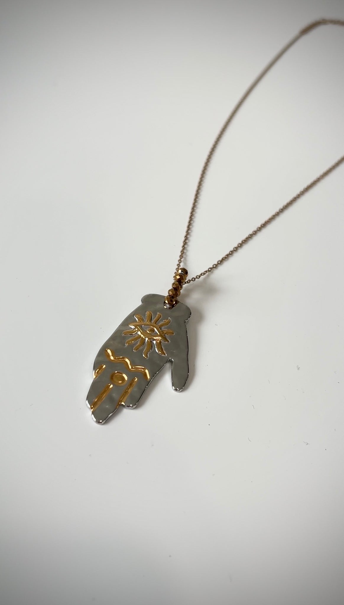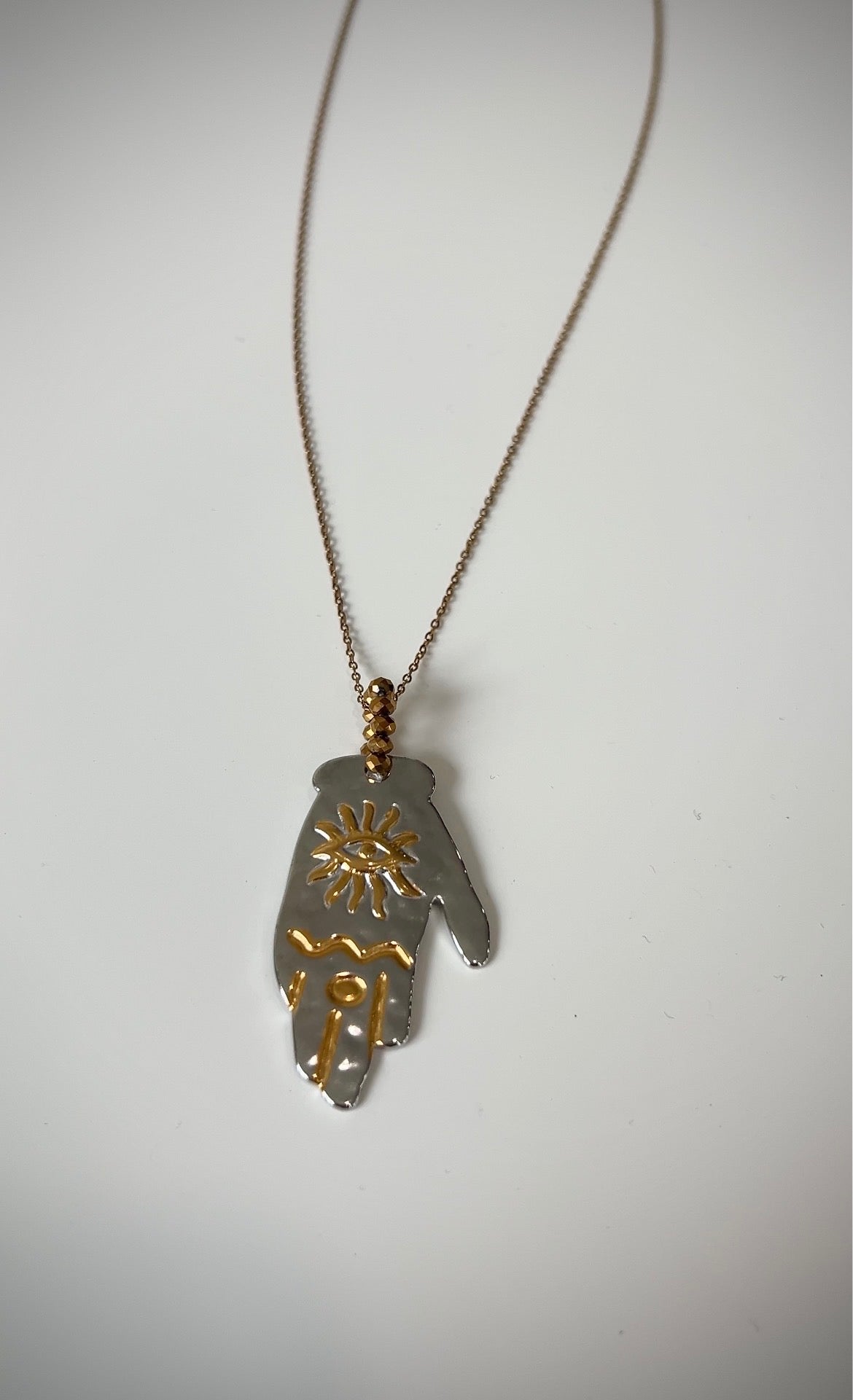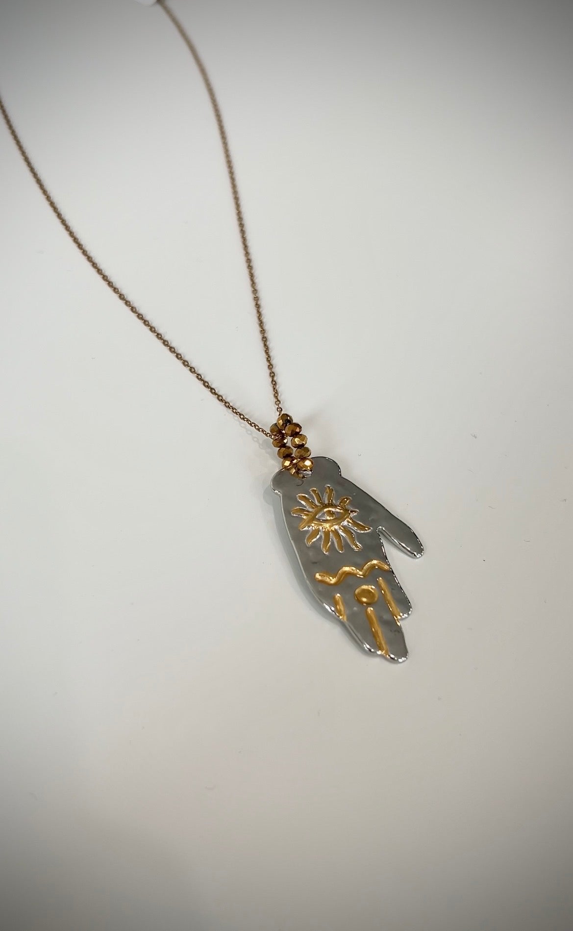 Stainless steel chain with a gold plated two tons hand charm full of crystals on top, ideal for a night out.
