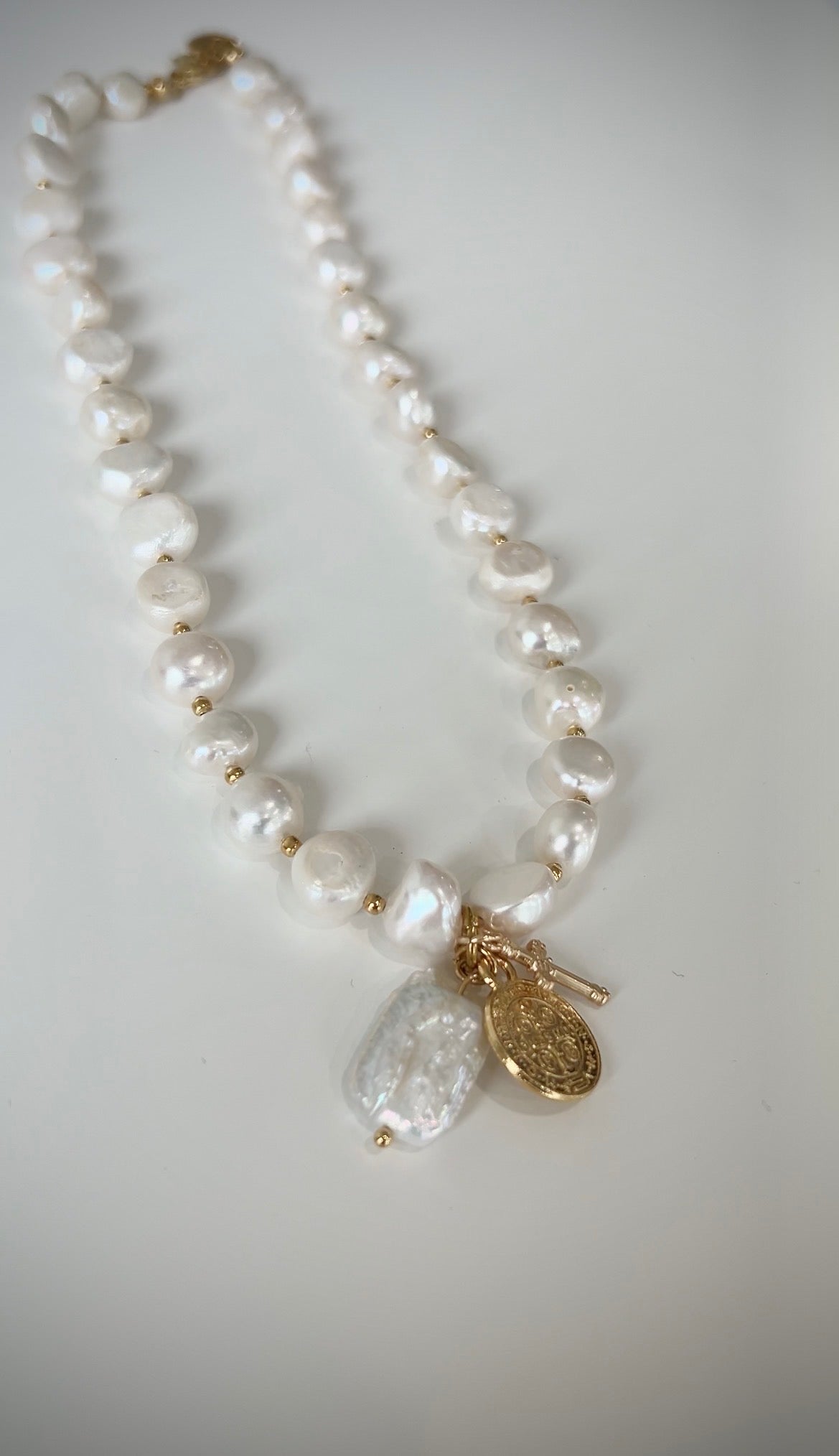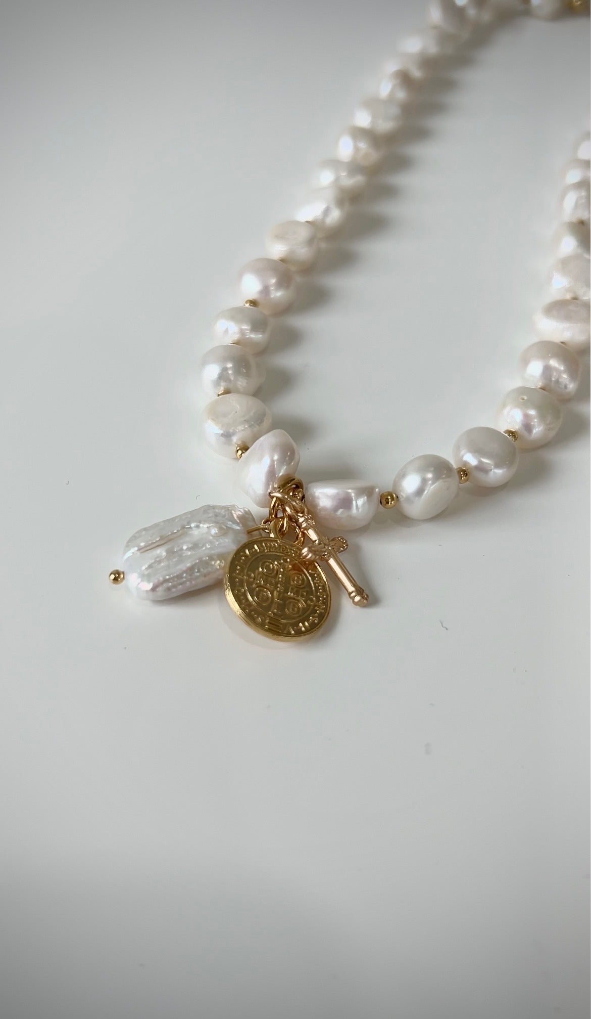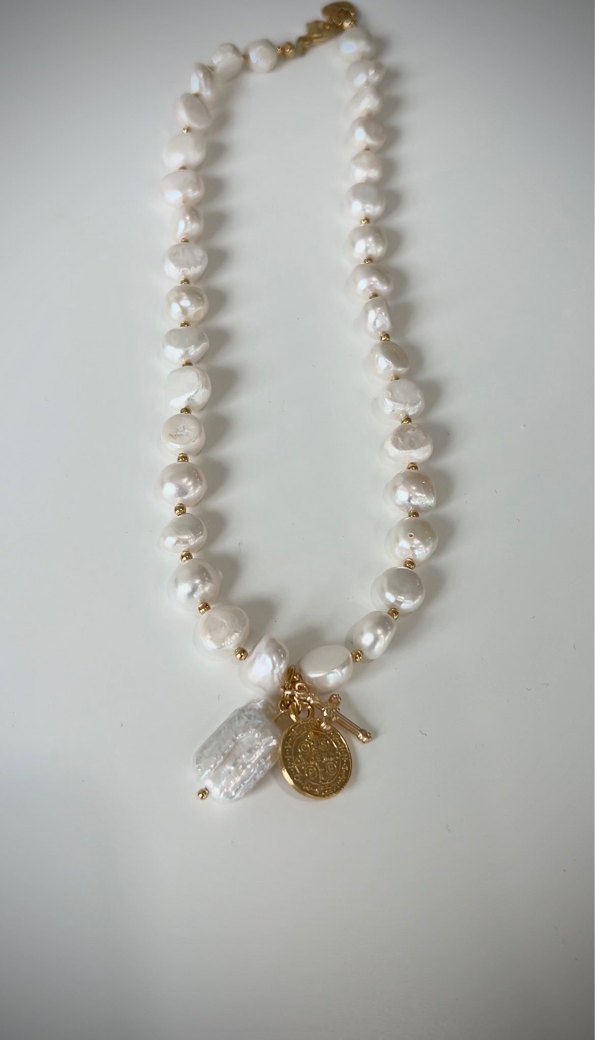 Water river pearls necklace paired with a baroque pearl and gold plated charms.